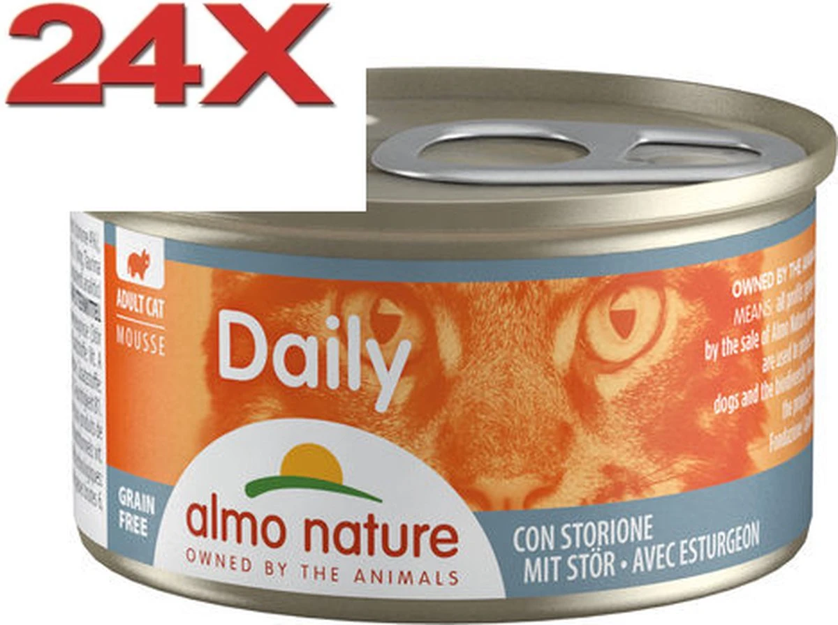 Almo Nature Daily Menu Mousse Kattenvoer – Blik – Steur is een overheerlijke mousse voor uw kat. Deze maaltijd bevat smakelijk vlees en vis met daarnaast nog groente, ei en rijst. Deze kattenvoeding bevat geen kunstmatige kleurstoffen en conserveringsmiddelen.