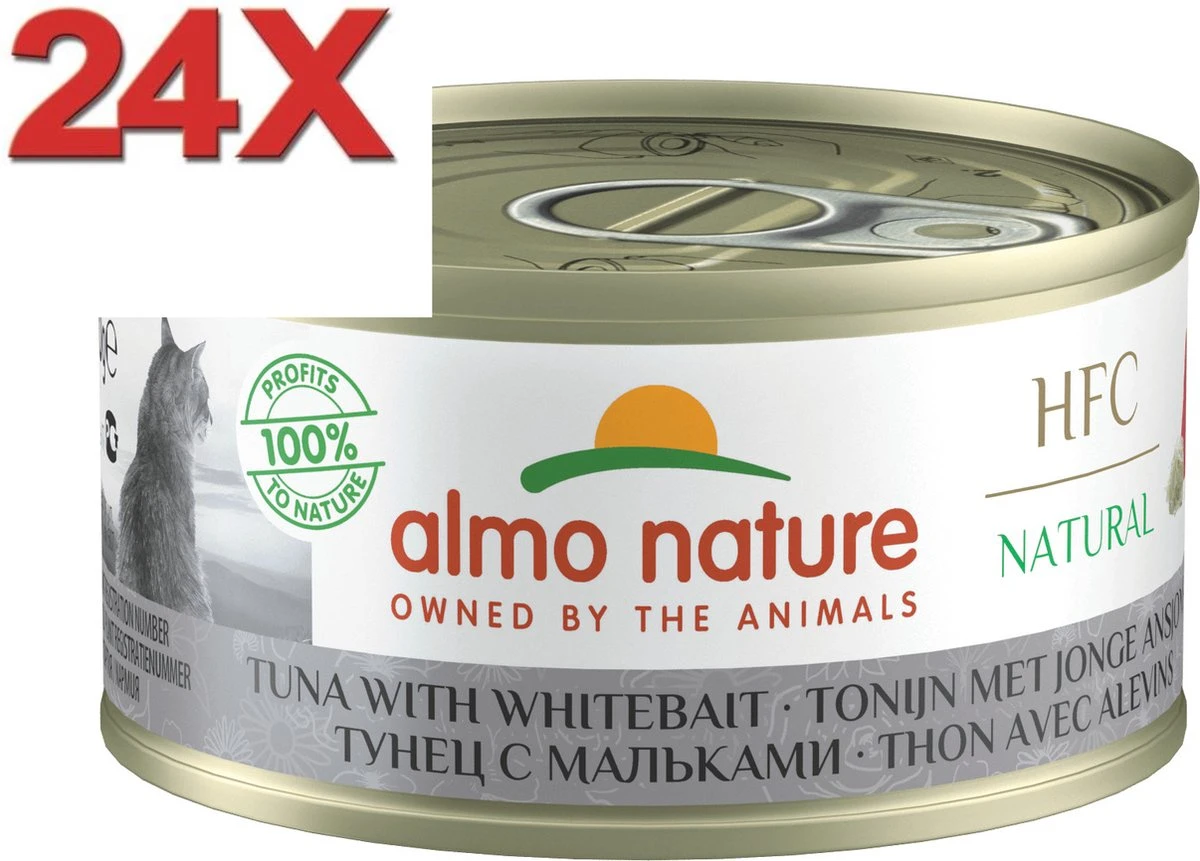 Almo Nature HFC Natural Tonijn en Jonge Ansjovis (blikjes 70 gram) is een zeer smakelijk natvoer dat gegeven kan worden aan volwassen katten van alle rassen. Almo Nature producten bevatten uitsluitend 100% natuurlijk ingrediënten die van hoge kwaliteit zijn. Bij de bereiding van de producten wordt dan ook geen gebruik gemaakt van conserveringsmiddelen, kleur- geur- en smaakstoffen of andere chemische hulpstoffen.